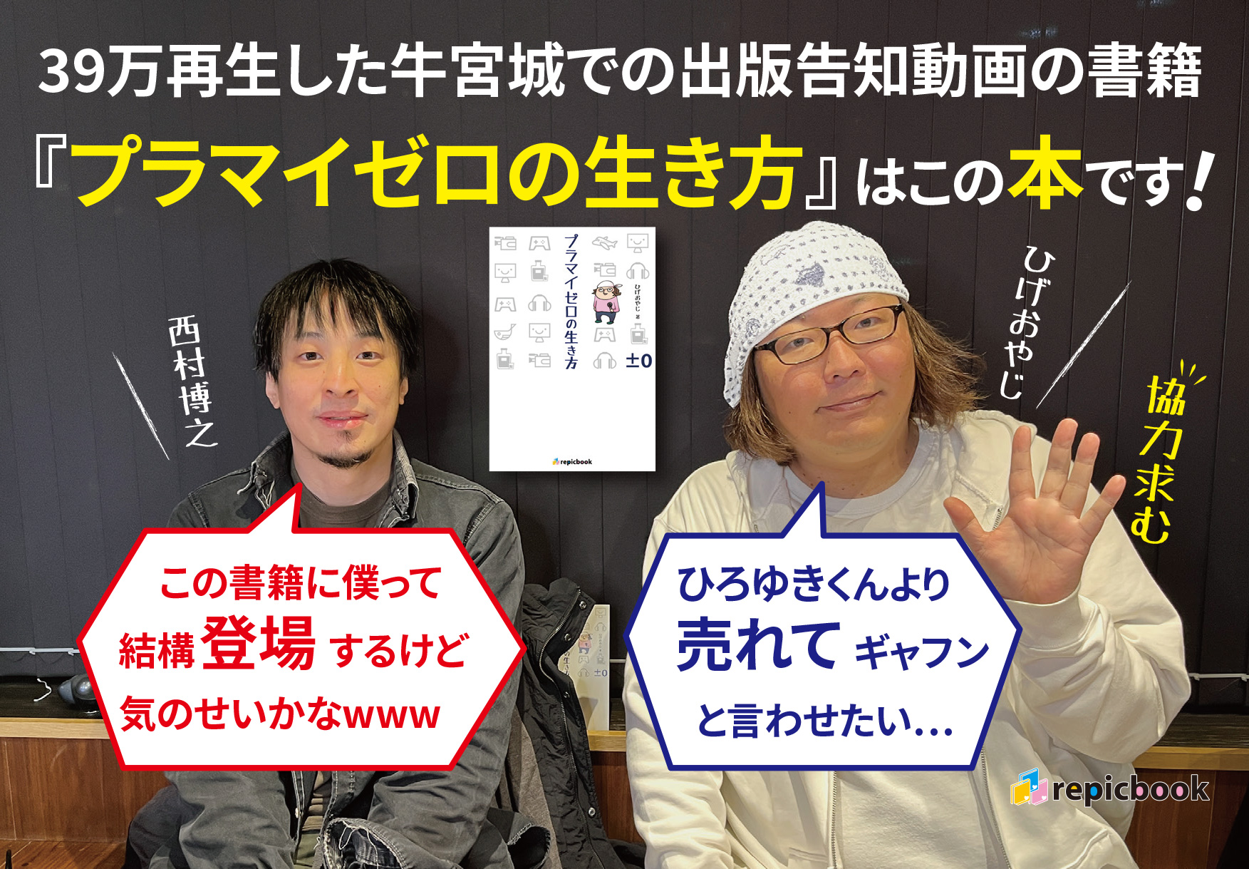 実用書や児童書を中心に刊行している出版社、repicbook(リピックブック)株式会社(本社:埼玉県志木市、代表取締役:諏訪部 貴伸)は、2022年3月20日に宮迫博之氏が経営する焼肉店「牛宮城」にて、2ちゃんねる開設者で実業家のひろゆき氏と著者のひげおやじ氏が、YouTubeから公開出版対談をした書籍「プラマイゼロの生き方」を、2022年6月1日(水)より全国の書店で発売します。