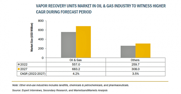 蒸気回収装置の市場規模は、2022年の8億米ドルからCAGR3.9%で成長し、2027年には10億米ドルに達すると予測されています。COVID-19パンデミックの影響を受けた後、石油・ガスおよび製造部門の回復、規制の厳格化、生産用の石油・ガスおよび石油化学製品の増加により、世界中で蒸気回収装置市場の需要が高まっています。市場の成長は、石油・ガス産業の成長と一致しています。一方で、世界的なCOVID-19パンデミックにより、2020年の蒸気回収装置市場は下落しました。