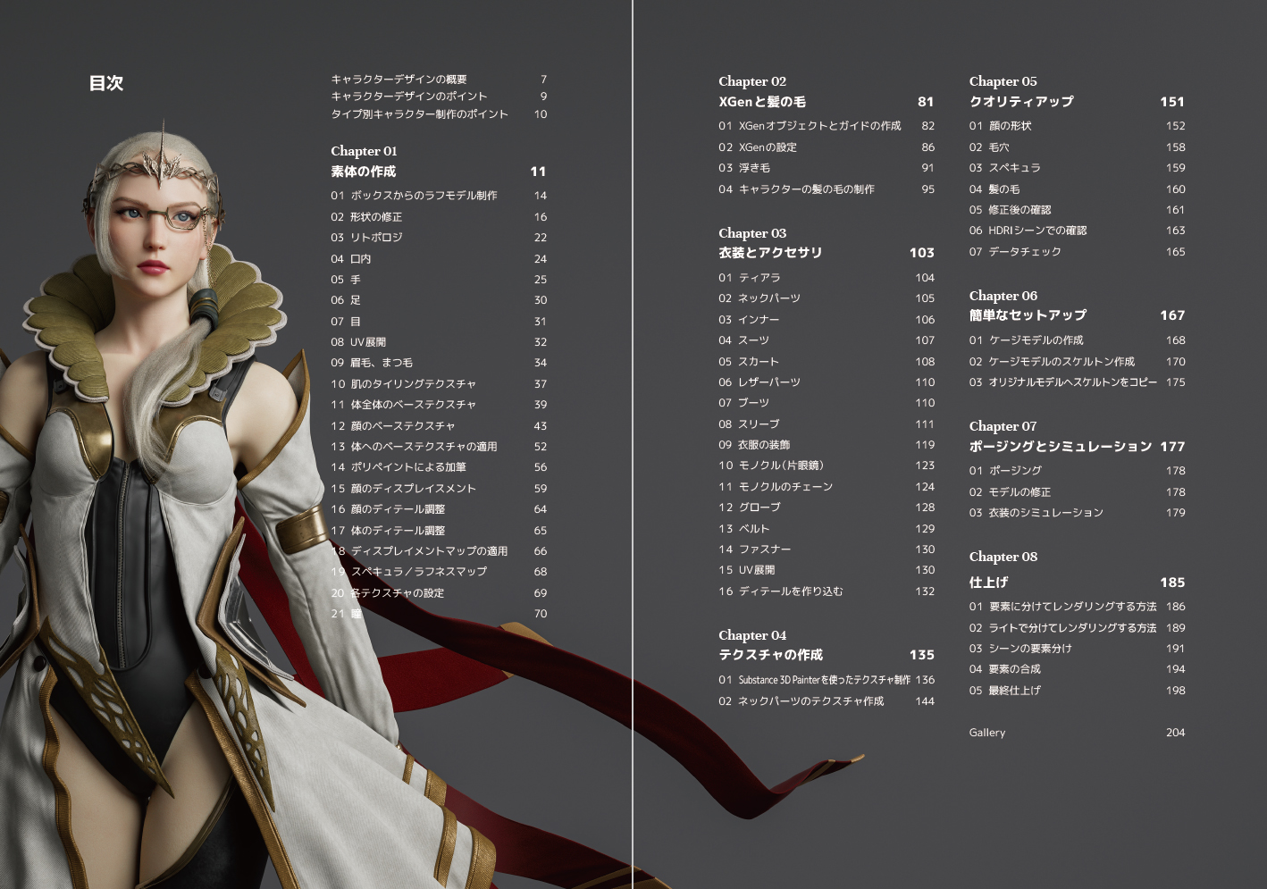 多くキャラクターモデルのベースにできる素体。そして、髪の毛、衣装、アクセサリ制作のポイントを紹介。完成データを参照して、ハイクオリティなCGキャラクター制作の秘訣を学びましょう。