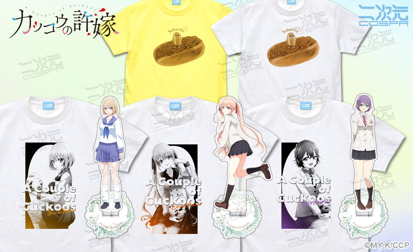 「TVアニメ『カッコウの許嫁』」より、作中でおなじみのゆるキャラ "そばっしー" のTシャツや天野エリカたちのアクリルスタンドなど、新作グッズが二次元コスパから登場!