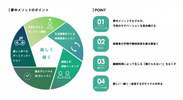 独自の学習メソッドである「夢中メソッド(R)」(※1)を用いたレッスンにより、「GLOBAL CROWN」では半年の継続率94%を実現するなど非常に高いユーザー満足度を達成しています。
