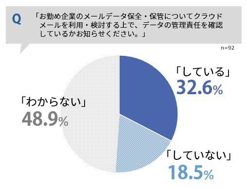 情シス担当者を対象に、クラウドメールのデータの管理責任を確認しているかを聞くと、もっとも多いのは「わからない」の48.9%でした。「確認していない」の18.5%とあわせると、驚くべきことに67.4%が管理責任を未確認の状態であることが分かりました。