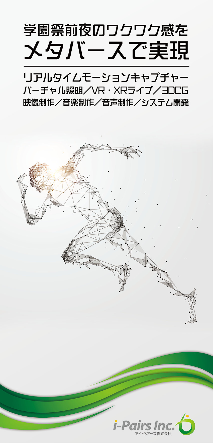 アイ・ペアーズは、最先端のマルチメディアコンテンツを一元提供する「デジタルコンテンツ特化型クリエイティブカンパニー」です。音楽・音声・映像制作や3DCG等、コンテンツ制作の豊富な実績に加え、既存サービスの多言語対応やサービス企画/システム開発にも対応。DX(デジタルトランスフォーメーション)に関する様々なお客様のニーズにお応えするプロフェッショナルサービスを、高品質かつリーズナブルな価格設定でご提供しています。