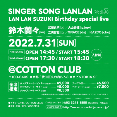2022年7月31日(日)鈴木蘭々のバースデースペシャルライブ『SINGER SONG LANLAN vol.3』が丸の内 COTTONCLUBにて開催されます。