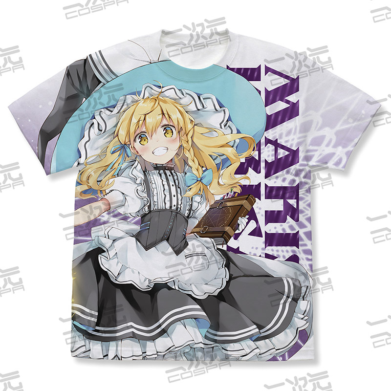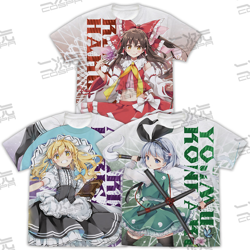 『東方Project』えれっと氏による博麗霊夢、なつめえり氏による霧雨魔理沙、魂魄妖夢イラスト使用「フルグラフィックTシャツ」など二次元コスパから登場です。