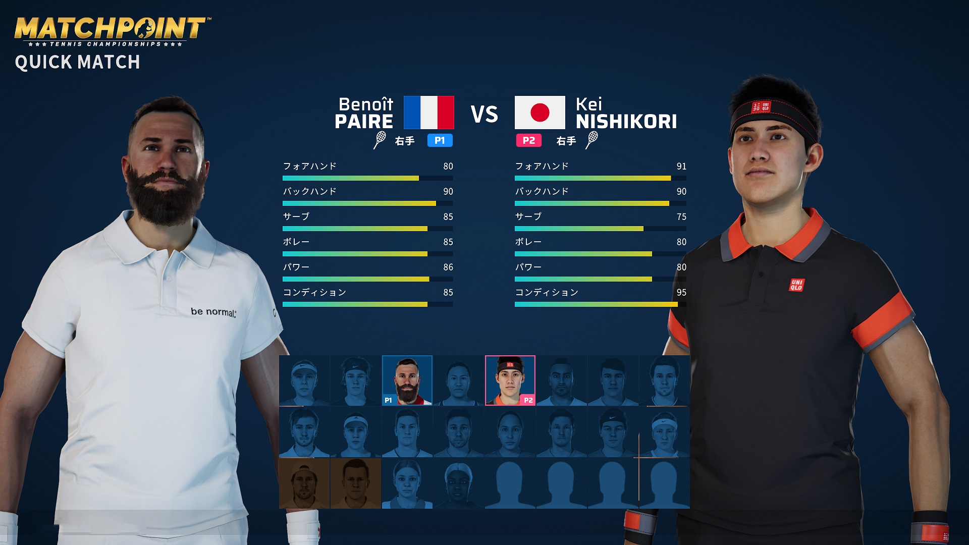 世界の第一線で活躍する16選手が実名で登場。日本が誇る錦織圭選手(以下選手敬称略)はもちろん、今シーズン目覚ましい成長を遂げているスペインの19歳 カルロス・アルカラスやアメリカのアマンダ・アニシモバなど、今のテニス界をリードする世界のトッププレーヤーとのマッチアップをお楽しみいただけるほか、選手たちをプレイアブルとして選択することも可能です。戦略を極めたCPUとの歯ごたえある一戦に加えて、ローカルやオンライン対戦でも楽しめるモードです。