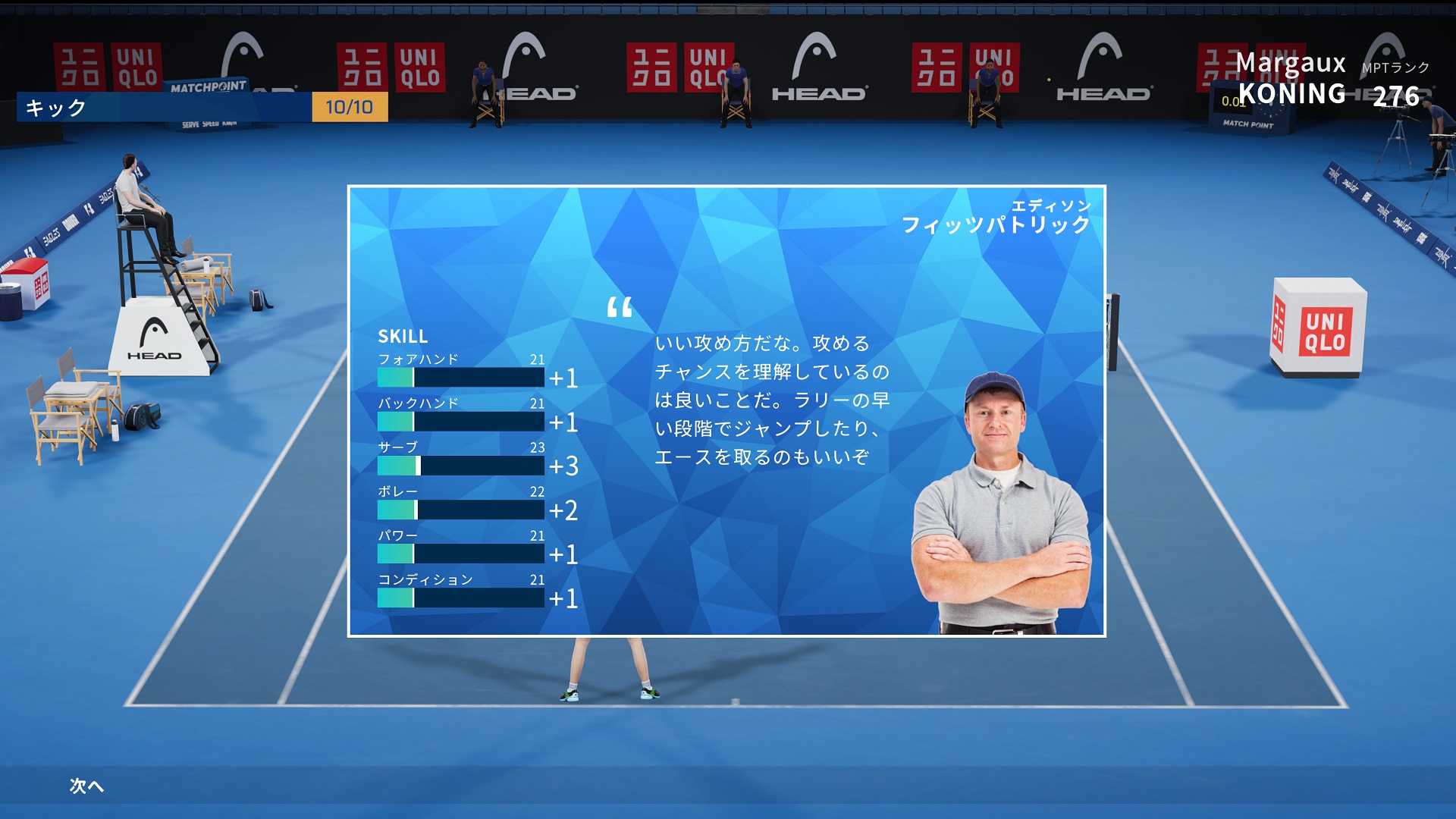 テニス選手なら一度は憧れるグランドスラムを目指してオリジナルキャラクターをカスタムし、リアルなテニスの世界を模したMPTツアーに参戦!コートの種類に応じてショットの速さやコース、スピンなどの配球をコントロールしながら、敵の長所や短所を見極めて自分だけの『勝ち筋』を見つけることが勝利への第一歩。大会の合間に開催されるイベントやミニゲームに参加してポイントを獲得したり、シューズやラケットなどのギアを手に入れたりと、キャラクターの能力値を高めるための必勝シナリオを戦略的に実践していこう!