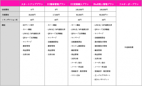 今までもビジネスの規模やご都合に合わせて4つのプランからお選びいただける料金体系をご用意しておりましたが、よりきめ細かにご要望にお応えするとともに、新たにECビジネスを検討されている方がよりスムーズに参入できるように、「スタートアッププラン(初期費用0円・月額費用28,000円)」「EC簡単管理プラン(初期費用0円・月額費用17,000円)」「EC継続購入プラン(初期費用100,000円・月額費用50,000円)」「BtoB売上管理プラン(初期費用100,000円・月額費用50,000円~)」「フルオーダープラン(別途お見積り)」の5つの料金プランにブラッシュアップいたしました。