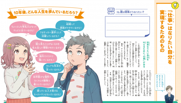 こう質問すると日本の子どもたちは「パティシエになりたい」「サッカー選手になりたい」など、憧れの職業を答えます。ですが、アメリカの子どもたちに同じ質問をすると、「一軒家を建てて、海を眺めて暮らしたい」「結婚して3人の子どもと暮らしたい」など、将来どんな生き方をしたいかを答える人が多いのだそうです。もちろん、「職業」と「生き方」、どちらを書いてもOKですが、本書では、「どんな生き方をしたいか」を考えた上で、それを叶えられる職業を探せる一冊になっています。(p14より)
