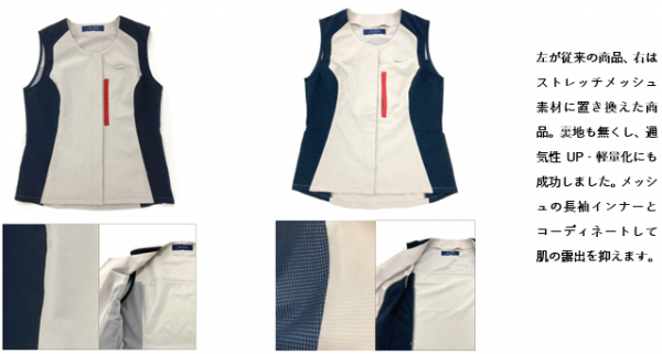 そこで、ミーサでは直ぐにご要望を取り入れ、人気の高いデザインをそのままメッシュ素材に置き換えて、肌の露出を抑えながら、より涼しく快適なウェアへと改良を行い、無事に納品をさせていただきました。
