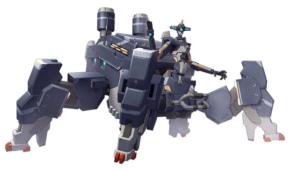 ブラックリバーに所属しない独自のAGS部隊体系を構築するため、PECSから誕生したN2E-888アラクネーです。アラクネーは4足歩行による安定的な地形適応性を発揮し、牙のようなレールガンで敵を無慈悲に突破します。またコイルを?き出しにしたが最後、周辺に強力な電子戦装備のEMPを展開して相手を無力化させます。たった1機で味方のアルゴリズムを改善し敵の攻勢を阻止する姿は、群れを支配する女王のようです。