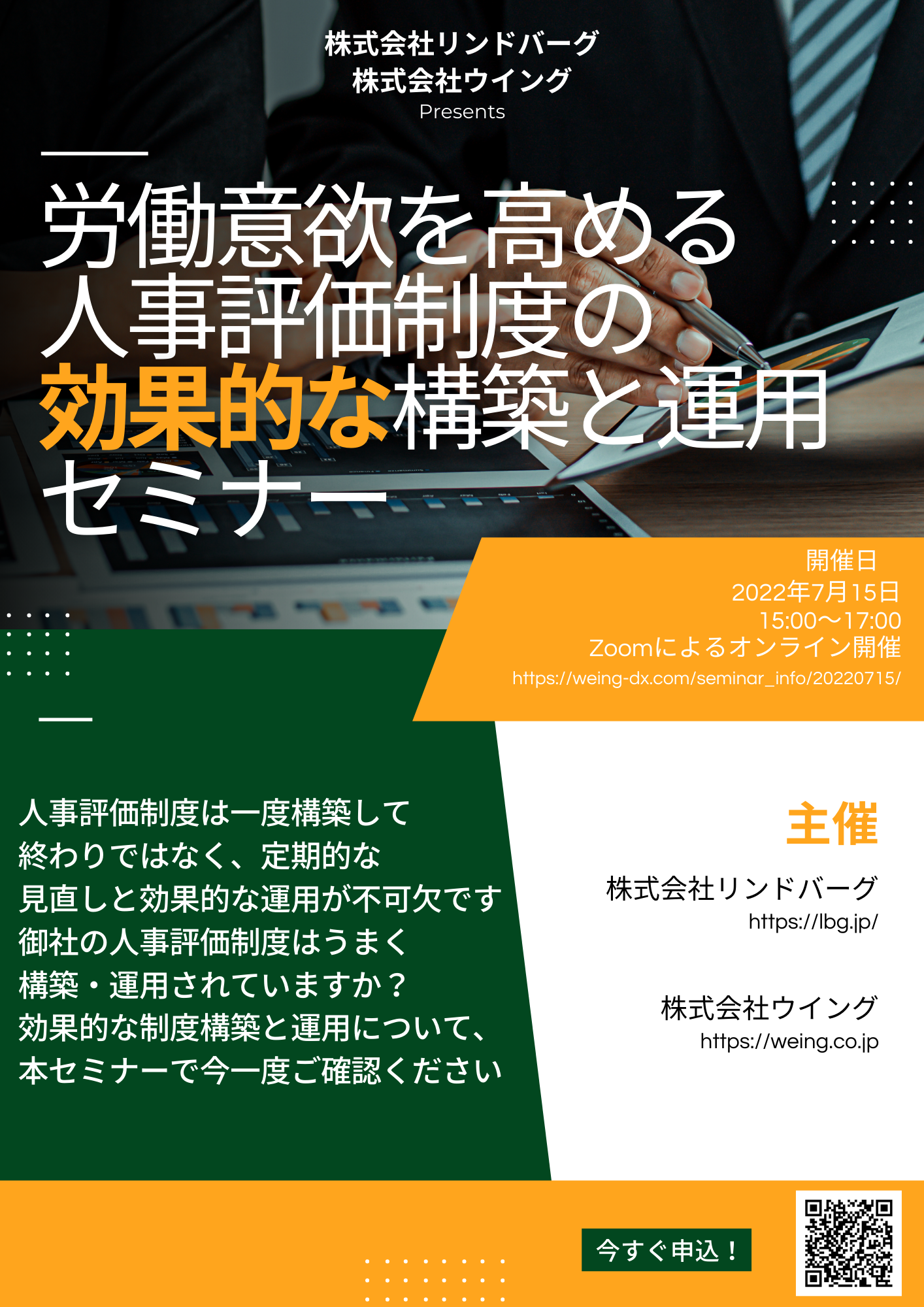 ソフトウェア開発を行う株式会社ウイング(所在地:東京都千代田区、代表取締役:樋山泰三)は、株式会社リンドバーグと共催で『労働意欲を高める!人事評価制度の効果的な構築と運用セミナー』を7月15日にZoomによるオンラインで行います。
