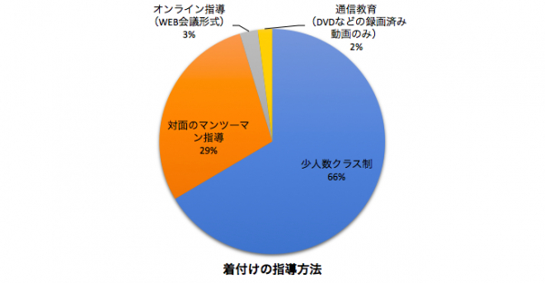 「少人数クラス制」は66%(129人)、「対面のマンツーマン指導」は29%(56人)、「オンライン指導(WEB会議形式)」は3%(5人)、「通信教育(DVDなどの録画済み動画のみ)」が2%(4人)でした。