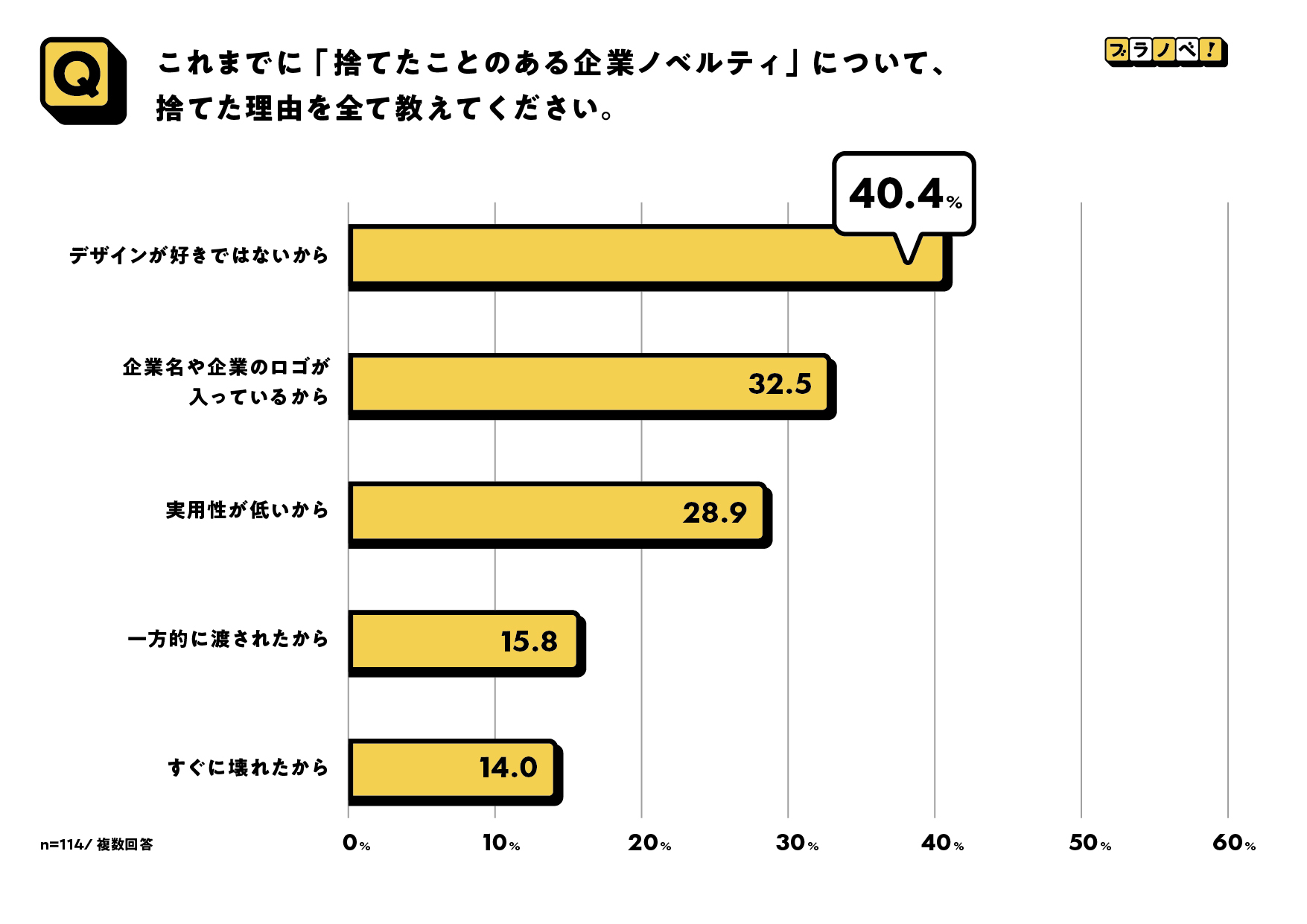 同調査で「ノベルティを捨てた理由」をたずねると、一番多い回答が40.4%で「デザインが好きではないから」。また「企業名や企業のロゴが入っているから」が2番目で、「デザイン性」を求める声が1位と2位の結果に。また、「実用性が低い」という結果が3番目と続きました。