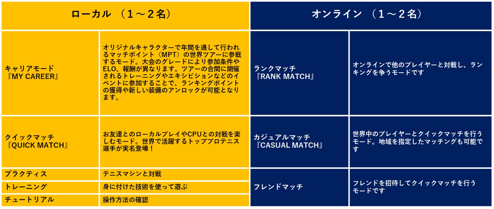 グランドスラムを目指すキャリアモードや世界のトッププロとの一戦が楽しめるクイックマッチなど、シングルプレイからマルチまでさまざまな遊び方を、ローカル/オンラインでお楽しみいただけます。対CPUや家族、お友達、そしてオンライン上のライバルとの対戦をお楽しみください。