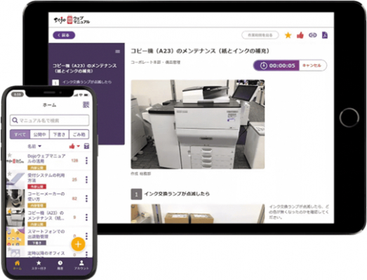 「Dojoウェブマニュアル」は、主に現場での作業マニュアルや機械操作の手順書などを、マルチデバイスで作成、管理できるシステムです。