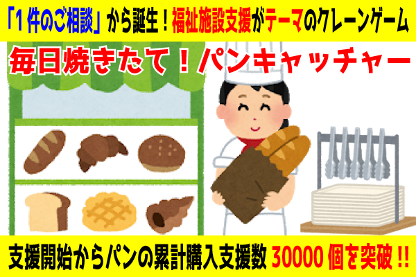 「笑顔創造」を企業理念とする株式会社東洋(代表取締役:中村秀夫 本社:埼玉県北本市 以下、当社)は、運営する、クレーンゲーム設置台数が約350台で、2012年に1店舗当たりのクレーンゲーム設置台数で世界初となるギネス記録に認定された、元祖・世界一のゲームセンター『エブリデイ行田店 (埼玉県行田市 』 にて、2021年4月1日より展開している、福祉施設支援のクレーンゲーム 【毎日焼きたて!パンキャッチャー 】が 、2022年6月30日で、購入支援させて頂いたパンの累計総数が30000個を突破致しました。