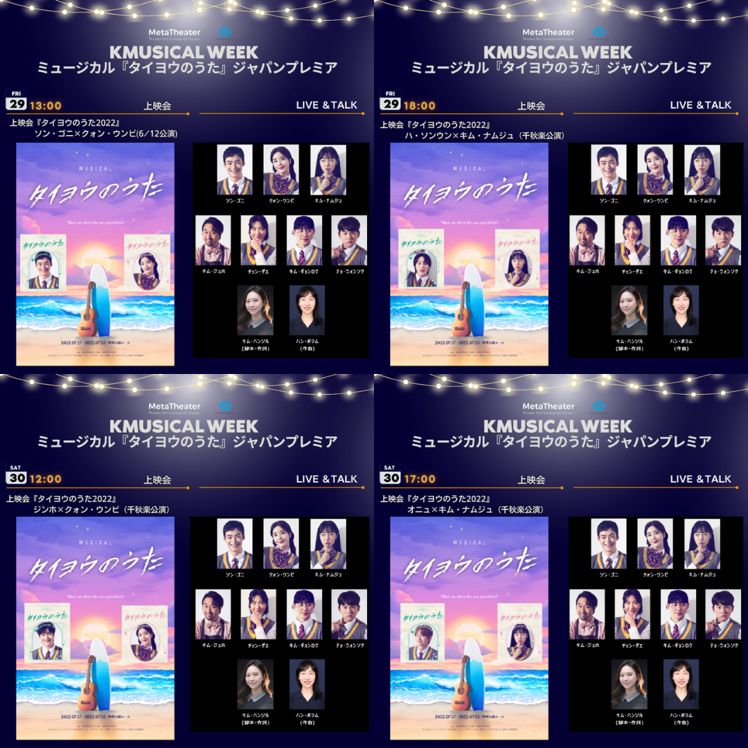 29日・30日の2日間はさらに特別なステージが準備された。夏の爽やかな日差しのなか、初々しさとときめきの初恋の想いを歌った、ミュージカル『タイヨウのうた2022』JAPANプレミア。【タイヨウのうたジャパンプレミア】は、6月に幕を下ろしたソウル公演の上映と共に、キャスト達によるナンバーをステージにて披露するだけでなく、キャスト、創作陣らの公演ビハインドストーリーも紹介予定だ。MCにはK-ミュージカルのパイオニアであり、「今日も韓国ミュージカル日和」の著者でもある田代親世がさらに作品、キャストの魅力を掘り下げてくれるだろう。