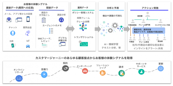 お客様との通話記録、ソーシャルフィード、Webサイト上の行動履歴などの顧客体験シグナルと運用データを単一プラットフォーム上に収集します。集められた体験シグナルは、A IやM Lで分析され、そこから得られたインサイトは組織内を横断して共有されます。この際、解約リスクのあるお客様など緊急性の高い情報は組織内の適切な担当者にアラートし、即時の対応を促します。単一ソースのデータを組織横断で使用することで、部署横断で一貫したお客様のブランド体験を把握できるようになり、お客様視点での運用改善や製品、サービスの開発に取り組みやすくなります。