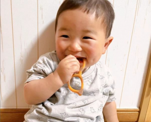 美味しそうに、嬉しそうにメガネ食べてる(?)のが新鮮、赤ちゃんとワンちゃんはメガネが大好きなんですよ(アイメガネスタッフ)