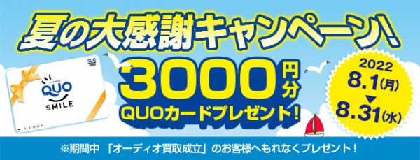 オーディオ高額買取専門のカウカウマート株式会社(本社:神奈川県川崎市、代表取締役:小島 淳子)は、日頃の感謝を込めて、2022年8月1日(月)~2022年8月31日(水)までの期間中、中古オーディオ買取専門「オーディオマート」( https://www.audio-cowcow.com/ )をご利用いただき、オーディオ買取が成立したお客様に、もれなく3,000円分のQUOカードをプレゼントする夏の大感謝キャンペーンを実施いたします。