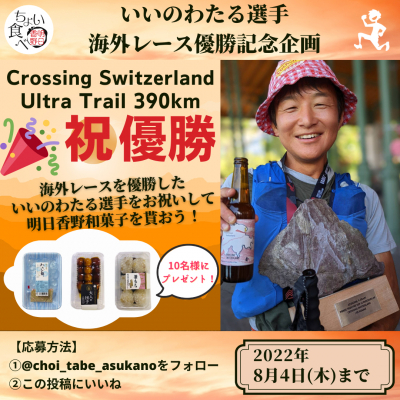 もともとは出場する予定ではなかったレースに帰国を延長して挑戦し、優勝するという快挙を達成したいいのわたる選手。そんな規格外ないいのわたる選手を皆さまとお祝いしたいという気持ちから、明日香野のサブアカウント、ちょい食べ明日香野で優勝をお祝いするキャンペーンを7月27日から開催しました。