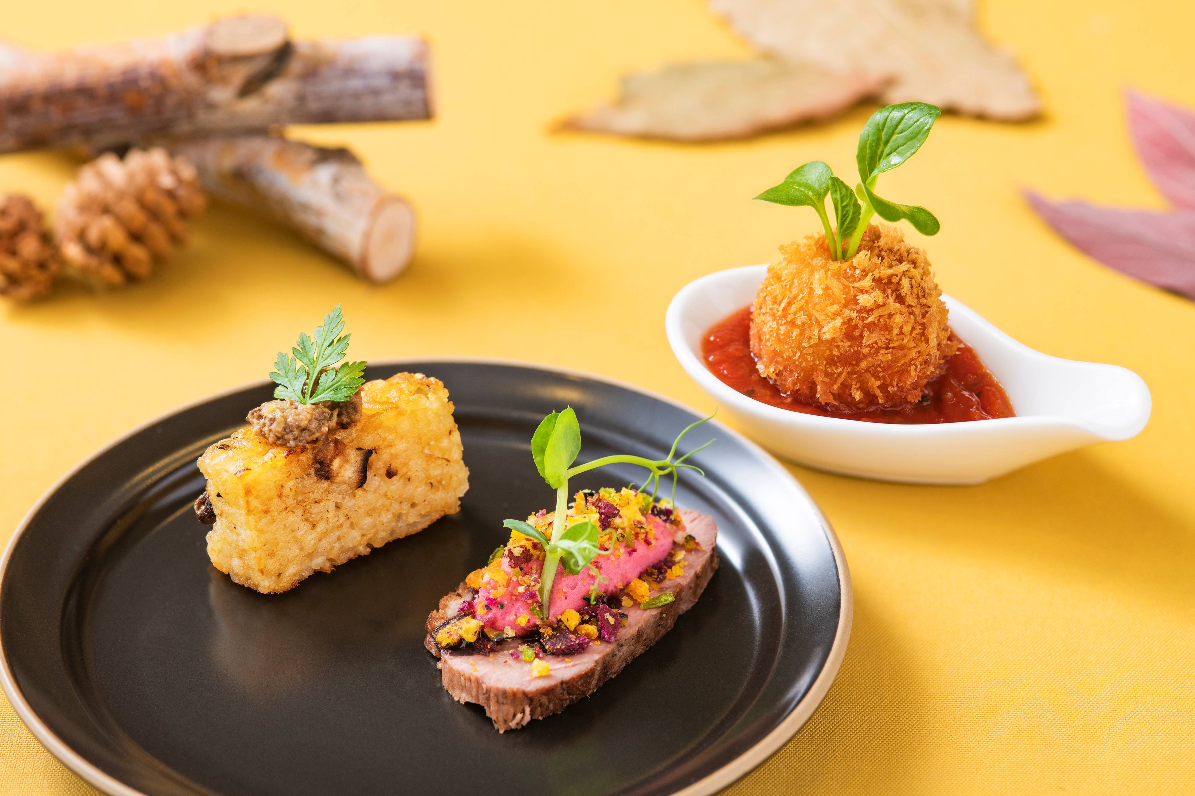 セイボリーの「かぼちゃのヴルーテ」は、なめらかなソースという意味を持つヴルーテを、ムース状にしました。ポワローネギやベーコンで風味をつけたかぼちゃをピューレにし、チキンコンソメでコクを出しています。下に敷いたパンプキンスパイスのクッキーのサクサクとした食感もお楽しみください。「鴨と秋野菜のクランブル」は、低温調理した柔らかい鴨肉に、カシスリキュールとポートワイン、赤ワインビネガーを煮詰めたほんのり酸味のあるソースをかけました。仕上げにビーツで赤く色付けしたマッシュポテトをのせ、サツマイモ、かぼちゃ、紫芋などの秋野菜のクランブルを振りかけた秋らしい一品です。