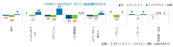 外食・中食市場の2022年6月は、売上10.2%減(2019年同月比)