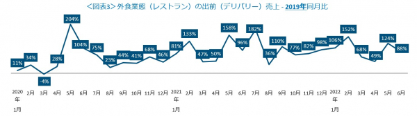 外食業態計(レストラン計)の出前(デリバリー)売上2019年同月比をみると(図表3)、プラス成長が続いています。デリバリー増加のピークは2020年5月の204%増ですが、その後も2ケタ増が続き、特に2021年2月(133%増)、同5月(158%増)、同7月(182%増、2022年は、2月(152%増)、5月(124%増)が特に大きく伸びました。6月は、同88%増とプラス成長だったものの、前月同様に、2020年、2021年の同月と比べて下回っており、これまでの爆発的な成長から、穏やかな成長になりつつあります。