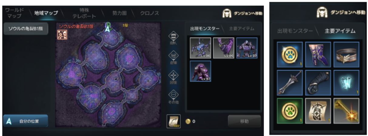 上記のアイテムをはじめ様々なドロップアイテムを新規ダンジョン「ソウルの亀裂B1階」で獲得することができます。