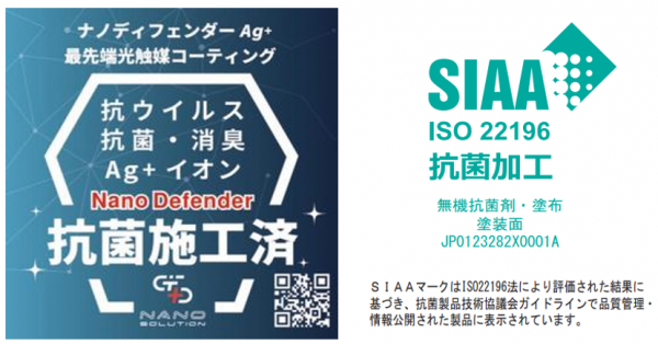 ナノソリューション株式会社はSDGsを推進し、“世のため人のため”に取り組む「ソーシャル企業認証制度 S認証」取得も一般社団法人ソーシャル企業認証機構より受けておりまた、弊社製品である「ナノディフェンダーAg+」は、SIAA(一般財団法人 抗菌製品技術協議会)で所定の試験に合格し抗菌性・安全性が認定された製品となっております。SIAAマークは、国際標準であるISO22196に準じて行われた耐久性試験後も細菌の増殖割合が百分の一以下であり、SIAAが独自に決めた安全性基準◎急性経口毒性◎皮膚一次刺激性◎皮膚感作成◎変異原性を満たしている製品にのみ表示が許されるマークです。のため弊社商品を正しい施工方法で施工すると、細菌の増殖を抑えることができ、施工面を衛生的に保ち安心・安全を創出します。ナノソリューション株式会社は様々な業種様に安心できる環境(抗菌・抗ウイルスの対策を)お届け出来るように致します。また、「光触媒コーティング」の認知度向上を加盟店と密に連携して参ります。