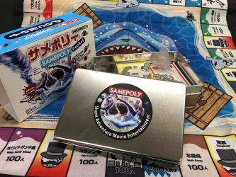 サメポリーポケットは2019年より発売中のサメ映画版モノポリー型ゲーム「サメポリー」のパッケージを1/4サイズまで縮小した改良バーション。価格も半額近いプライスに変更した。