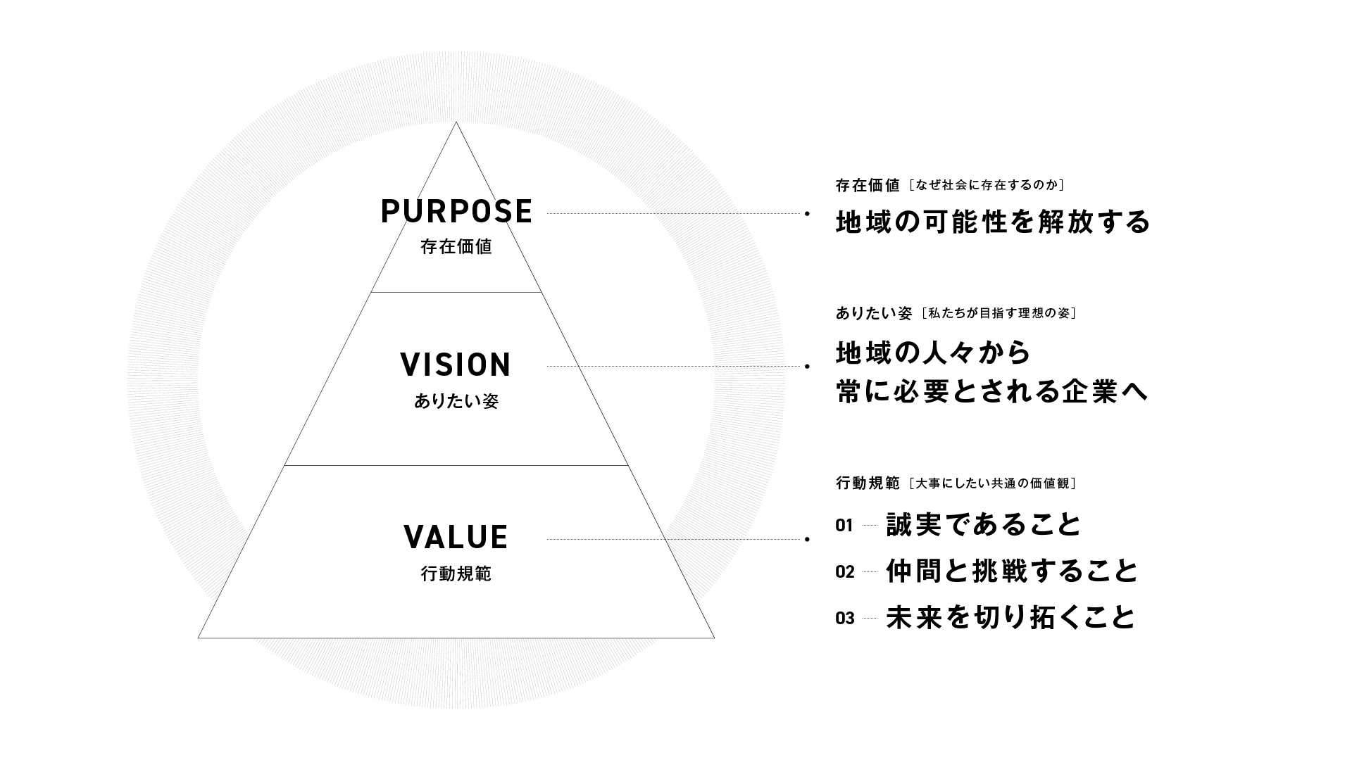 制定にあたっては、地域には沢山のチャンスが存在しており、地域を元気にすることで、地域から日本を元気にしたいという創業時より想いかつ信じてきたことを明文化しました。企業活動を通じて、地域の未来を創造できる想いと力を持った人材を増やし、地域課題を解決する事業を創り、広げていくことで、当社はパーパスの実現を目指してまいります。