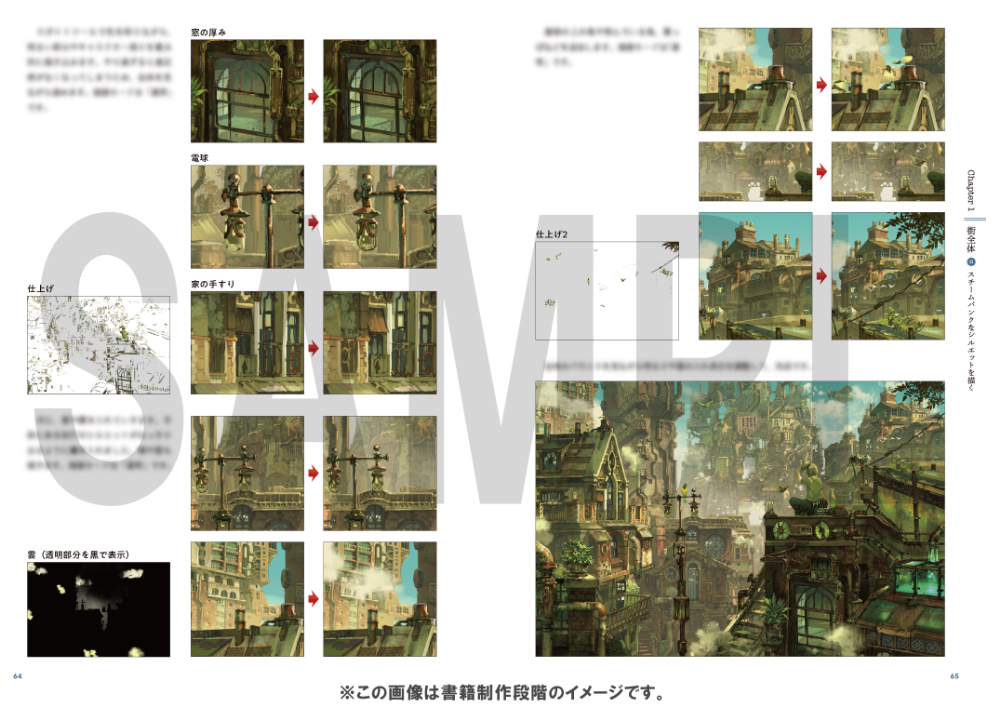 湖畔にたたずむ廃墟、趣ある家具がひしめく室内、華やかな装飾をまとうキャラクターたち、スチームパンク風にアレンジされた乗り物など、六七質が織りなす魅力的な世界観を存分に味わうことのできる一冊となっています。
