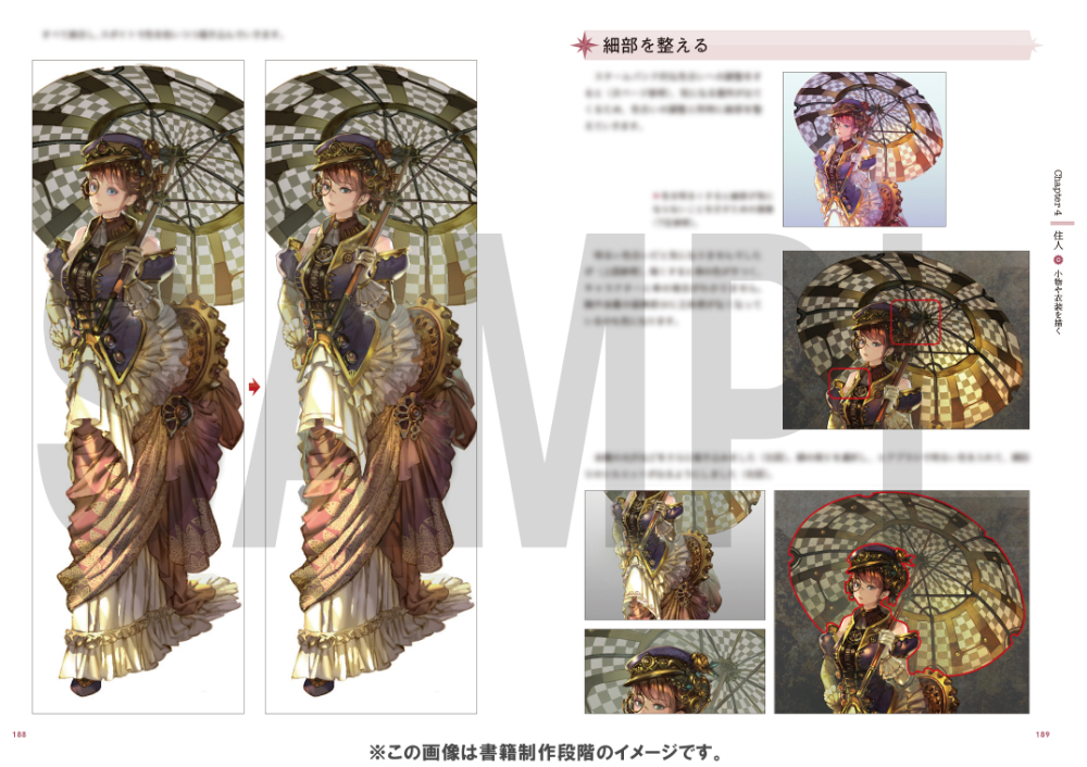 レイヤー構造や塗りの基本、Photoshopの3D機能を用いた制作フロー、遠近感を持たせる方法、時間帯ごとの演出の仕方、背景やオブジェクト、キャラクターや衣装の描き方など、多数の作品メイキングを通して解説!