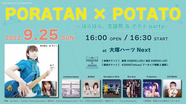 昨年はコロナウイルスの感染が拡大している状況を鑑みイベントを中止、今年 2022年はウイルス感染症対策を施し、9回目となる誕生祭に、今回で5回目となる POTATO party(フライドポテトをこよなく愛する集い)を合体させ「PORATAN × POTATO」というタイトルイベントの開催を決定しました。