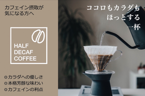 Half Decaf Coffeeは、カフェインがフルでもゼロでもない、ちょうど心地良いカフェイン量になっており、カフェインがもたらす利点と、しっかりとしたコーヒーの香りと味わいをダブルで楽しんでいただけるコーヒーです。