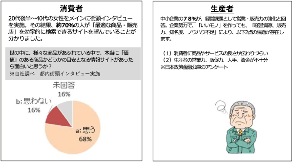 そして、『いいモノ』情報を知りたいという消費者と、それを伝えたいという生産者の商品を、同じ土俵で公平に紹介します。この方法なら、消費者が「簡単」に「いいモノ」が探すことができます。