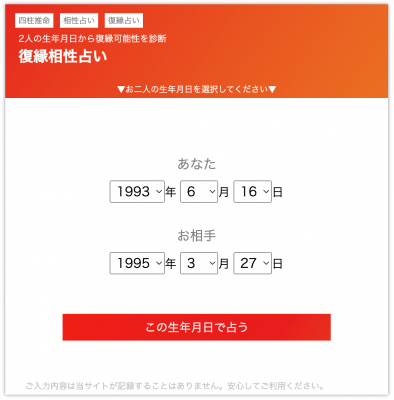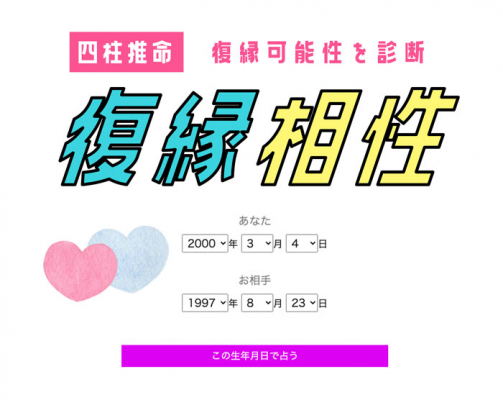 利用者は、自身と相手の生年月日を選択することで無料で占うことができ、東洋から伝わる占術のなかでとくに信頼度の高いと言われる『四柱推命』を用いて導き出された性格相性診断において『復縁可能性』をパーセンテージとして算出。復縁についての解説やその後の結末、アドバイスなどを受けることができます。