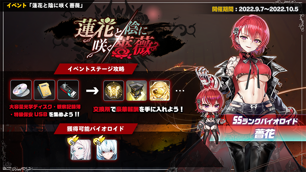 今回のアップデートで2部構成となる新シナリオイベント「蓮花と陰に咲く薔薇」が開催となりました!今回は第1部が公開となりました。イベントアイテムを集めるとSSランクのバイオロイドなど豪華報酬と交換することができますので是非この機会にプレイしてみてくださいね!!