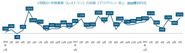 外食業態計(レストラン計)の出前(デリバリー)売上2019年同月比をみると(図表3)、プラス成長が続いています。デリバリー増加のピークは2020年5月の204%増ですが、その後も2ケタ増が続き、特に2021年2月(133%増)、同5月(158%増)、同7月(182%増、2022年は、2月(152%増)、5月(124%増)が特に大きく伸びました。7月も、同141%増と3桁の伸びでした。
