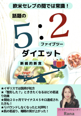「5:2 ダイエット」とは、「1週間の内、連続しない2日間をファスティング(絶食ではなく、 健康的な食事でカロリーを抑える)して、それ以外の日は好きに食事をしても良い!」 というとても嬉しいダイエット法。海外ではアマゾン(日本版)で「5:2ダイエット」と検索かけると200冊もの関連著書が出てきますので海外ではかなりポピュラーでありながら、日本では1冊も出版されておりません。従って、この度日本インターミッテントファスティング協会で日本で最初の書籍を出すことになりました。