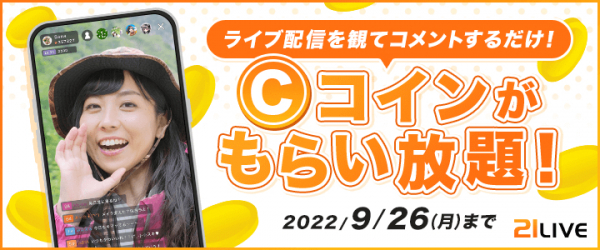 株式会社エムアンドティーティー(本社:沖縄県北谷町、代表取締役:井藤 三知子)が運営するエンターテイメント・ライブ配信サイト【21LIVE(ニーイチライブ)】URL: https://21.live では、9月13(火)から9月26(月)までリスナー向け企画を開催。配信視聴中に贈ったコメント数に応じてコインを付与します。