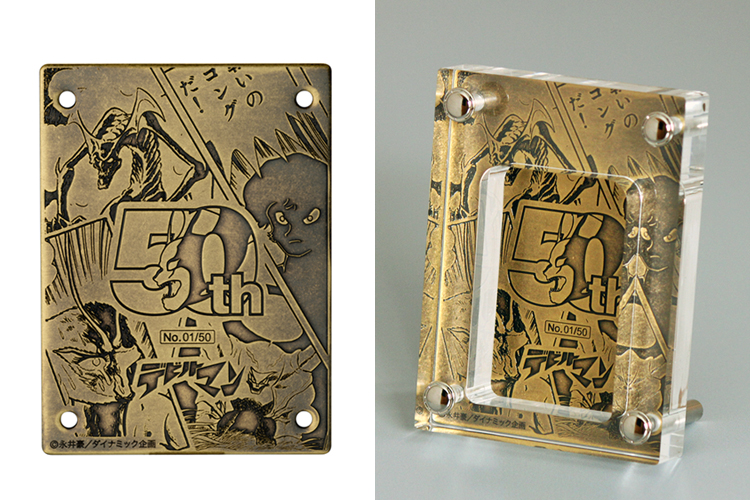 アートスタンドの背面には、記憶に残る名シーンとその中央に「デビルマン50周年」の記念ロゴをデザインした、真鍮製のプレートをセット。各キャラクターやデザインをエッチングして掘り下げ、バレル仕上げを施し重厚感を高めた、まさしく記念モデルに相応しい仕上がりとなっています。