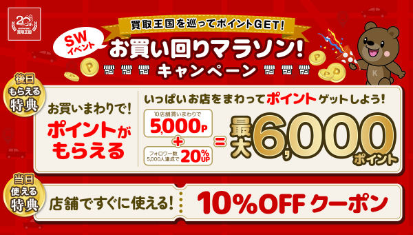 買取王国では、一号店の買取王国一宮店がオープンより20周年を迎えたことを記念し、20周年企画イベントとして、2022年9月16日(金)~2022年9月26日(月)の期間、買取王国を巡って買い物をすると、会員ポイントがもらえる「お買い回りマラソン!!キャンペーン」を実施いたします。この機会に是非お得に商品をお買い求めください。