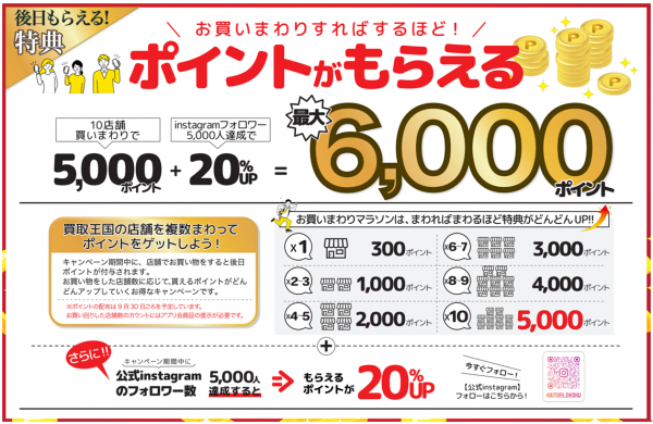 キャンペーン期間中に店舗で買い物すると、後日会員ポイントがもらえます。さらに、買取王国の店舗を複数回ってお買い物をすると、お買い物をした店舗数に応じて、貰える会員ポイントがどんどんアップしていきます。さらに、公式インスタグラムをフォローするとポイントゲットのチャンスもあります。