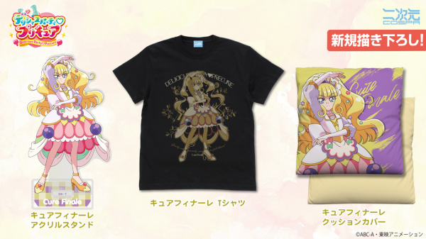 毎週日曜日8時30分から放送の『デリシャスパーティ プリキュア』より、キュアフィナーレの描き下ろしイラストを使用した「Tシャツ」「アクリルスタンド」「クッションカバー」をはじめ、キュアプレシャス、キュアスパイシー、キュアヤムヤム、キュアフィナーレ4人が勢ぞろいした「フルグラフィックTシャツ」など新グッズが二次元コスパから登場いたしました。