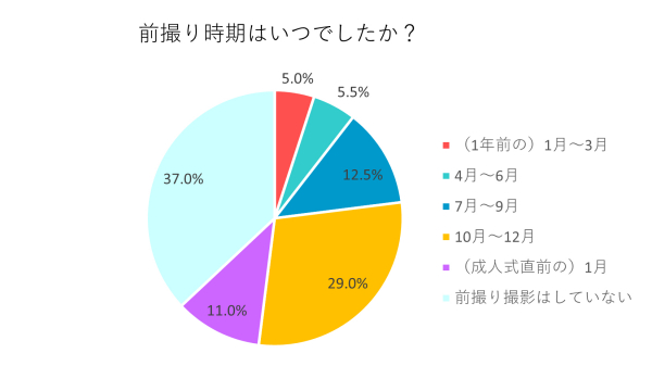 「(1年前の)1月~3月」が5%、「4月~6月」が5.5%、「7月~9月」が12.5%、「10月~12月」が29%、「(成人式直前の)1月」が11%、「前撮り撮影はしていない」が37%という結果に。夏の暑さが和らいだ10月~12月が人気のようです。