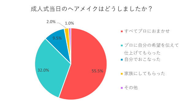 今回実施したアンケート調査では、9割近くの人がプロにサポートしてもらっていたことが判明しました。また、大半の人が満足のいく仕上がりで成人式に参加していたこともわかりました。