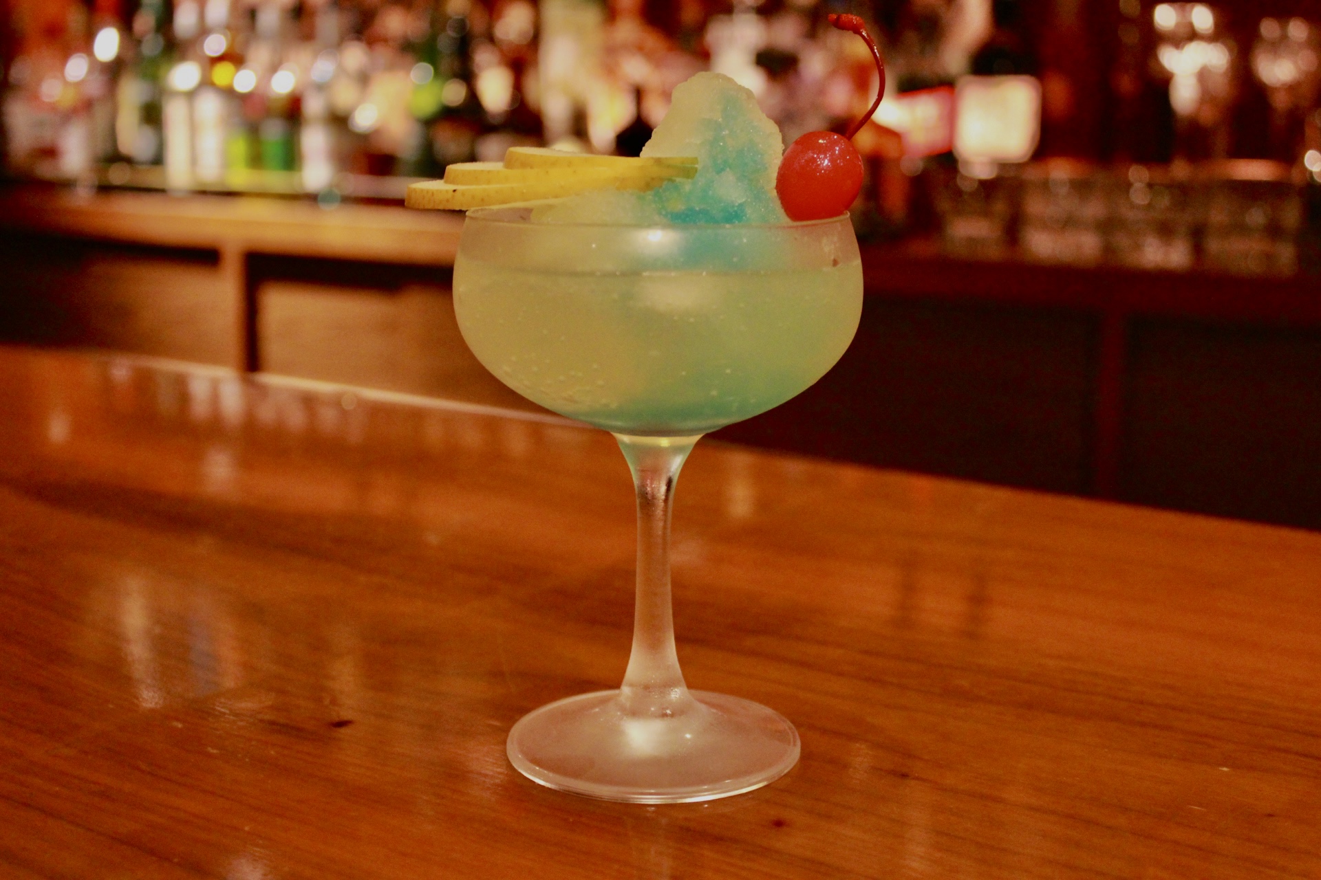シャキッとみずみずしい旬の和梨を使用したフルーツカクテル。マスカットのリキュールのフルーティーさとベルモットのほろ苦さの相性が抜群で爽やかな味わい。今が一番美味しい旬の梨を存分に味わってください。